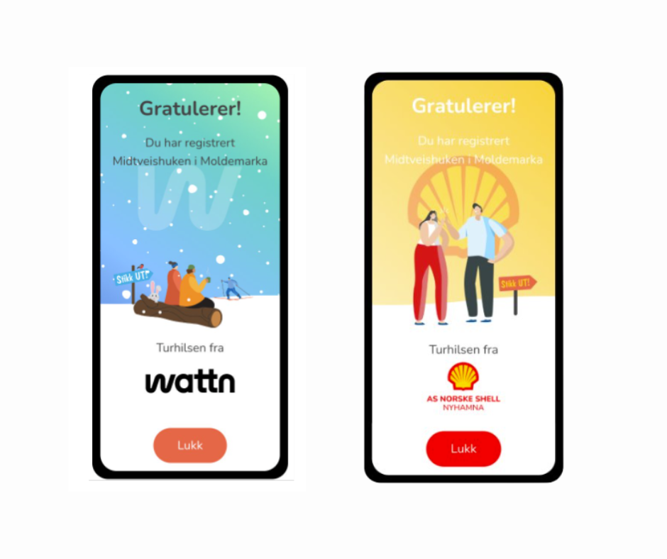 Stikk UT har en funksjon som kalles “Sponsorhilsen” eller med andre ord “Turhilsen”, som lar bedrifter gi en hilsen til alle som registrerer turene sine i appen. Når turgåeren registrerer seg på turmålet, dukker det opp en bekreftelse og logoen til bedriften med turhilsen. Her har vi muligheten til å vise frem de lokale bedriftene, samtidig som vi får sponsorstøtte som gir oss muligheten til å skape et godt produkt og videreutvikle våre tilbud. Vi håper å få til gode samarbeidsavtaler, som gir støtte til et viktig folkehelsetilbud i vår region! I 2024 hadde Stikk UT sin første sesong her i Vesterålen og Lødingen, og vi fikk med det en økning i antall deltakere. Her er det per nå mulig å nå ut til mellom 3-5000 spreke vesterålinger samt turister.